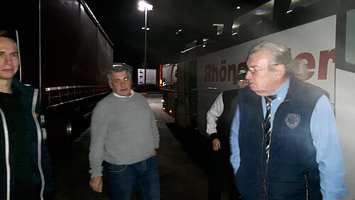 Da Rom nun nicht gerade um die Ecke liegt, sind wir schon am Vortag des Spiels gegen 15:00 Uhr in Arzell aufgebrochen. Wobei das nicht ganz richtig ist, da der Rhönsegler-Bus mit den beiden genialen Fahrern Martin und Thomas von Kaltennordheim über Geisa und Rasdorf in die Marktgemeinde kam, und dort schon ein paar Leute aufgegabelt hatte. Durch die schwierige Ticketvergabe hatten wir nur relativ wenige Tickets erhalten, und so machten sich nach Stops in Eiterfeld, Leimbach und Hünfeld, 24 Eitratal Adler auf den Weg nach Rom. Am Rasthof Tennenlohe, zwischen Erlangen und Nürnberg, stieß noch ein Mitglied zu uns. Details zur Ausschweifenden Party im Bus, die bis tief in die Nacht reichte, werden hier nicht preisgegeben. Überraschend für uns war, dass keinerlei Grenzkontrollen weder nach Österreich, noch nach Italien durchgeführt wurden, aber diesen Zeitvorteil nahmen wir gerne mit. Es folgten nun weitere Kilometer, über den Brenner, und "erst nach Bologna, und dann weiter nach Neapel"... Aber halt, zwischendurch gab es an einem äußerst schmucklosen italienischen Autobahnparkplatz erstmal Frühstück. Wurst, Käse, Marmelade, Gürkchen und Knoppers haben unsere partygeschwächten Leiber zusammengehalten, der Tag versprach viel, und er hielt mehr als Wort. Das erste Zusammentreffen mit den Carabinieri, oder auch den "Helden in Jogginghose" folgte kurz vor Rom. Alle raus, Tickets, Perso, einmal den Adler, abwarten. Nebenbei filzten die Cops noch einen anderen Bus, bei dem eine höchstgefährliche Schwimmnudel gefunden und von der Chefin persönlich entsorgt wurde.